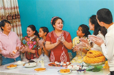 新疆乌鲁木齐市天山区黑甲山街道大湾北路西社区,各族群众在一起做月饼。
