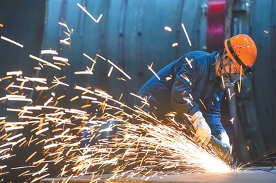 位于河南洛阳市的中信重工铆焊车间,工人在加工矿用磨机产品。