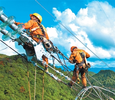 浙江省电力公司施工人员坚守岗位,对浙江天台抽水蓄能电站500千伏送出工程进行架线作业。