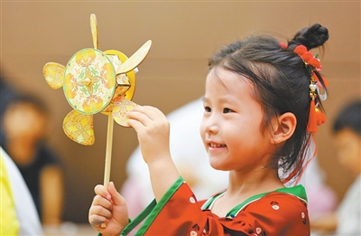 山东滕州市博物馆,小朋友在体验“风车转花灯”。