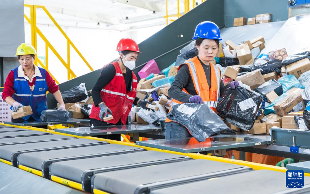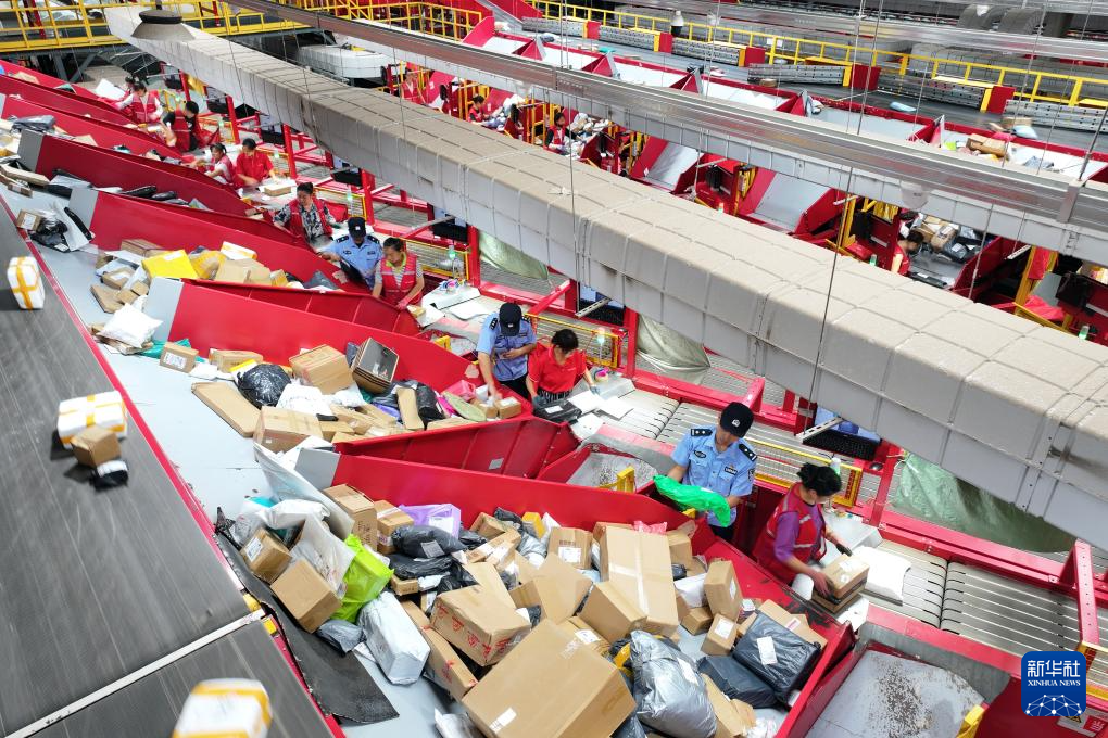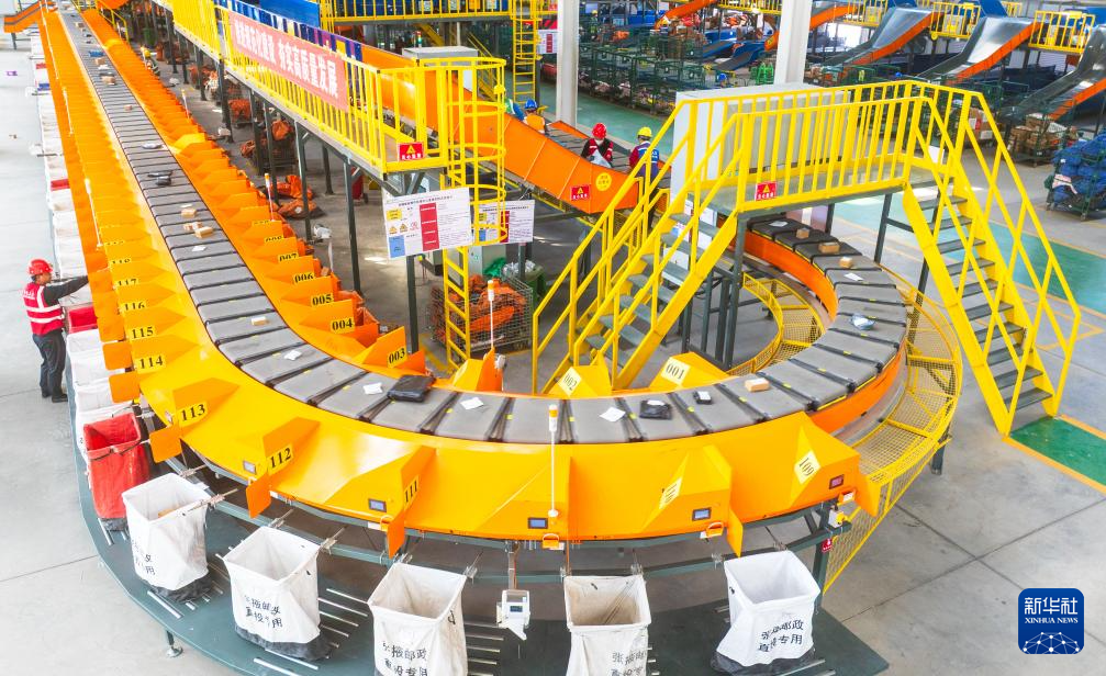 10月2日,工作人员在中国邮政集团有限公司甘肃省张掖市分公司邮件处理中心智能分拣流水作业线上工作。新华社发(杨潇摄)