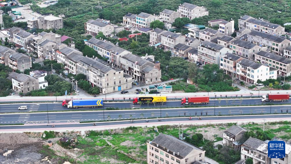 10月5日,物流运输车辆行驶在浙江省台州市路桥区的古窑大道上(无人机照片)。新华社发(蒋友青摄)
