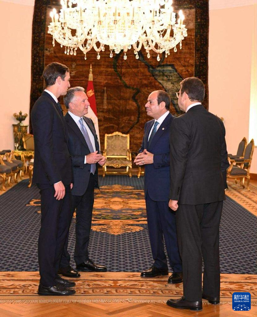10月9日,埃及总统塞西(右二)在开罗会见美国中东问题特使威特科夫(左二)和特朗普的女婿库什纳(左一)。新华社发(埃及总统府供图)