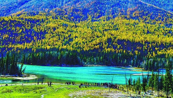 10月6日,游客在卧龙湾游玩拍照。国庆中秋假期,喀纳斯景区秋色迷人,吸引很多游客到此打卡。张宇翔 摄