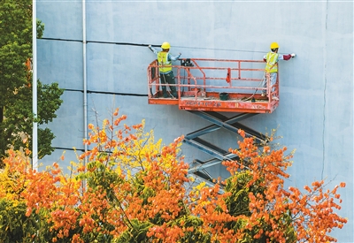 近年来,安徽省芜湖市繁昌区通过水电气改造、路面修缮、屋立面改造等措施,有效改善老旧小区的人居环境。图为工人在翻修繁昌区一老旧小区居民楼的外立面。