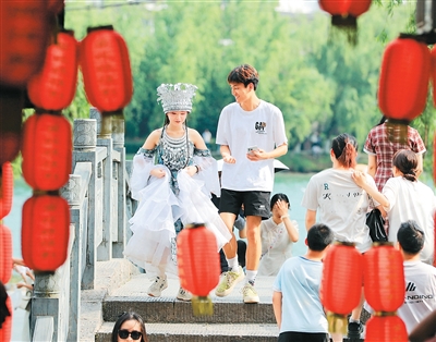 游客身着特色服饰,在镇远古城游览打卡。