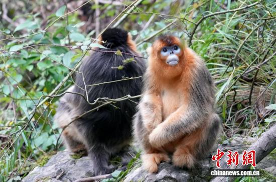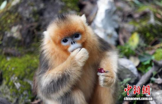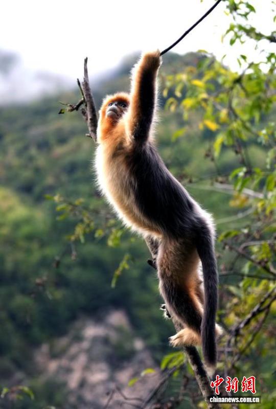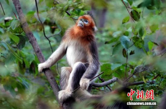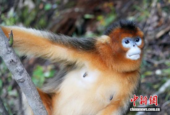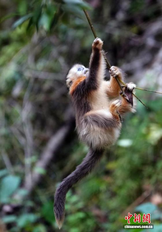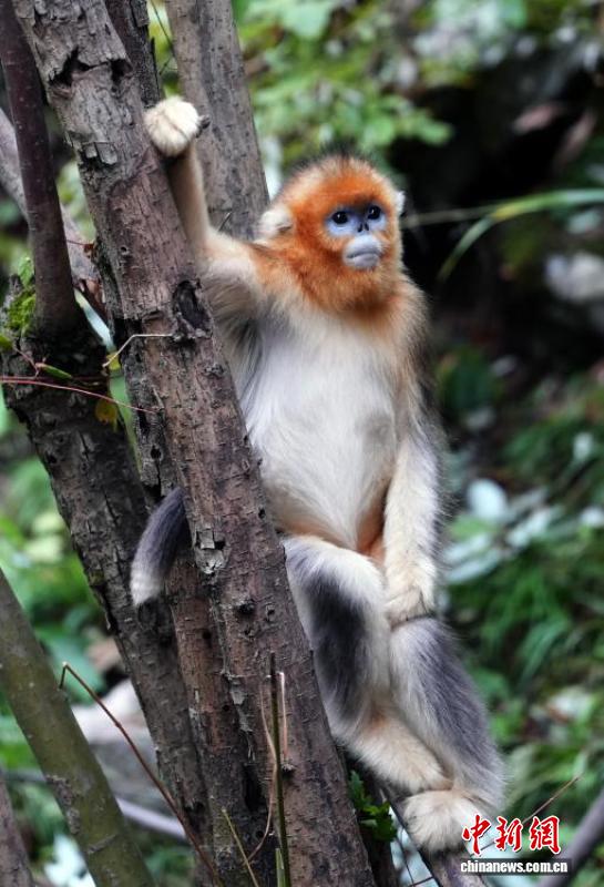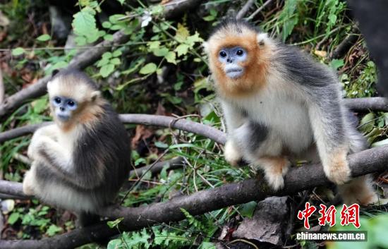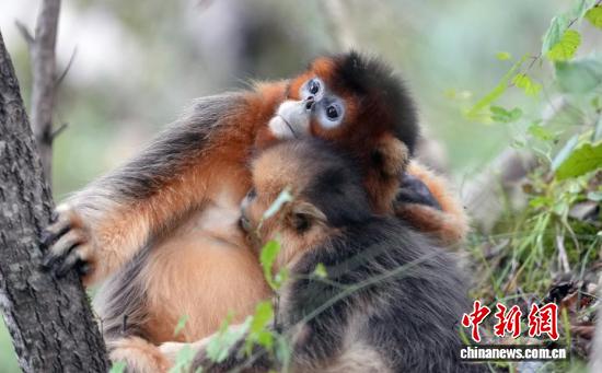 10月12日,在位于四川省阿坝藏族羌族自治州九寨沟县境内的白河金猴谷景区里,生活着约1700只野生川金丝猴,这些面颊呈淡蓝色,全身金黄、毛发油亮的川金丝猴在层峦叠翠的山林峡谷玩耍,动作轻盈、萌态十足。图为野生川金丝猴萌态十足。