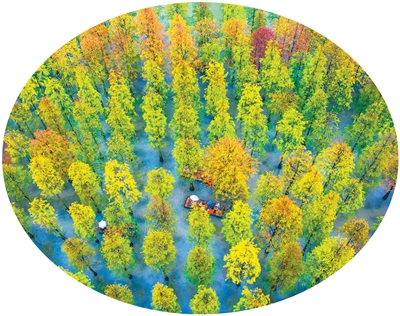 游客在江苏省宿迁市泗洪县洪泽湖湿地景区的梦幻水杉林下荡舟,畅享美好时光。