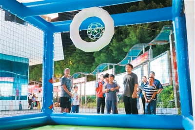 福建省科技馆“科学之夜”现场,青少年体验无人机足球。