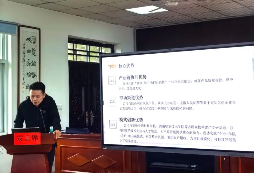 座谈会上,陕西渭皖谯科技种植有限公司总经理胡舒捷就企业概况、主营业务范围、核心优势及中草药项目的整体规划进行了详细介绍,为参会人员描绘了产业发展的潜在蓝图与合作前景。