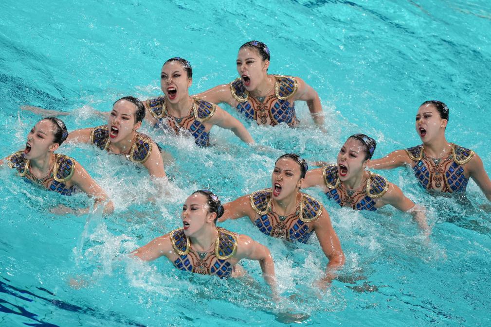 6月15日,中国队在2025年花样游泳世界杯总决赛集体技巧自选决赛中。新华社记者 邹竞一 摄