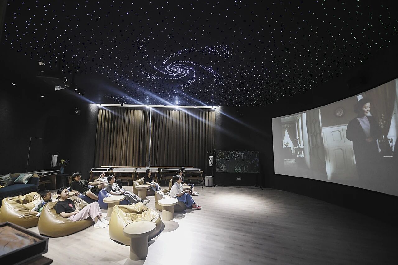 浙江省杭州市富阳区银湖街道合之舍书房影视厅内,附近的居民在观看电影。新华社记者 徐昱 摄