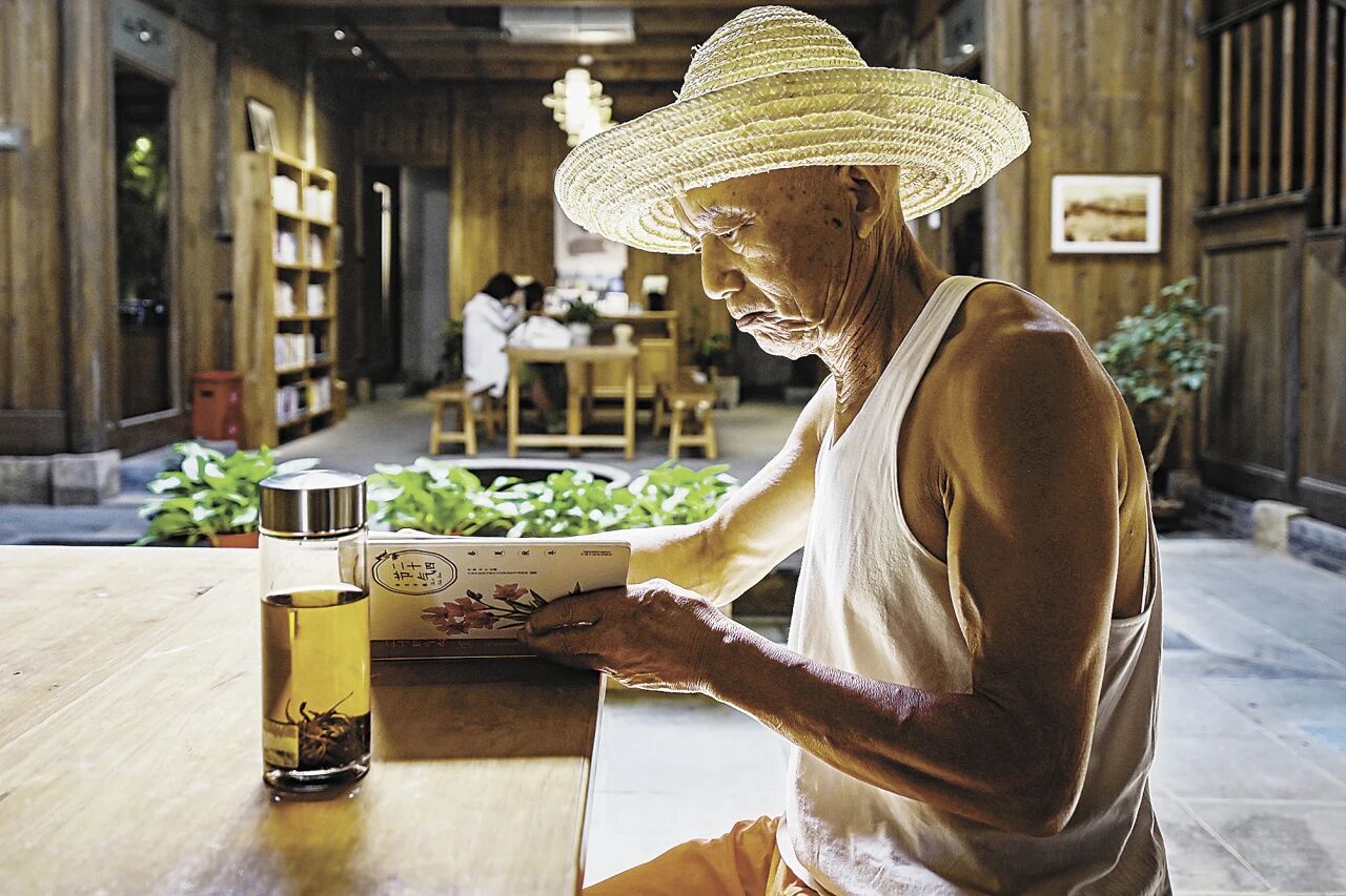 一名老人在位于安徽省芜湖市湾沚区的49号书房专心阅读。这座书房是在历史建筑基础上改造而成,室内陈设古色古香,打造沉浸式阅读氛围。杜玲 摄