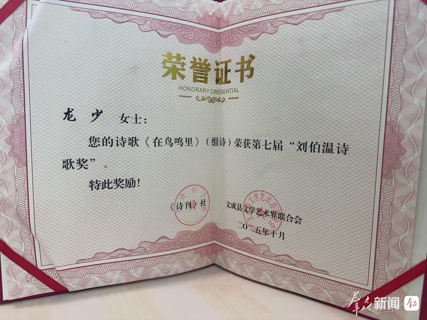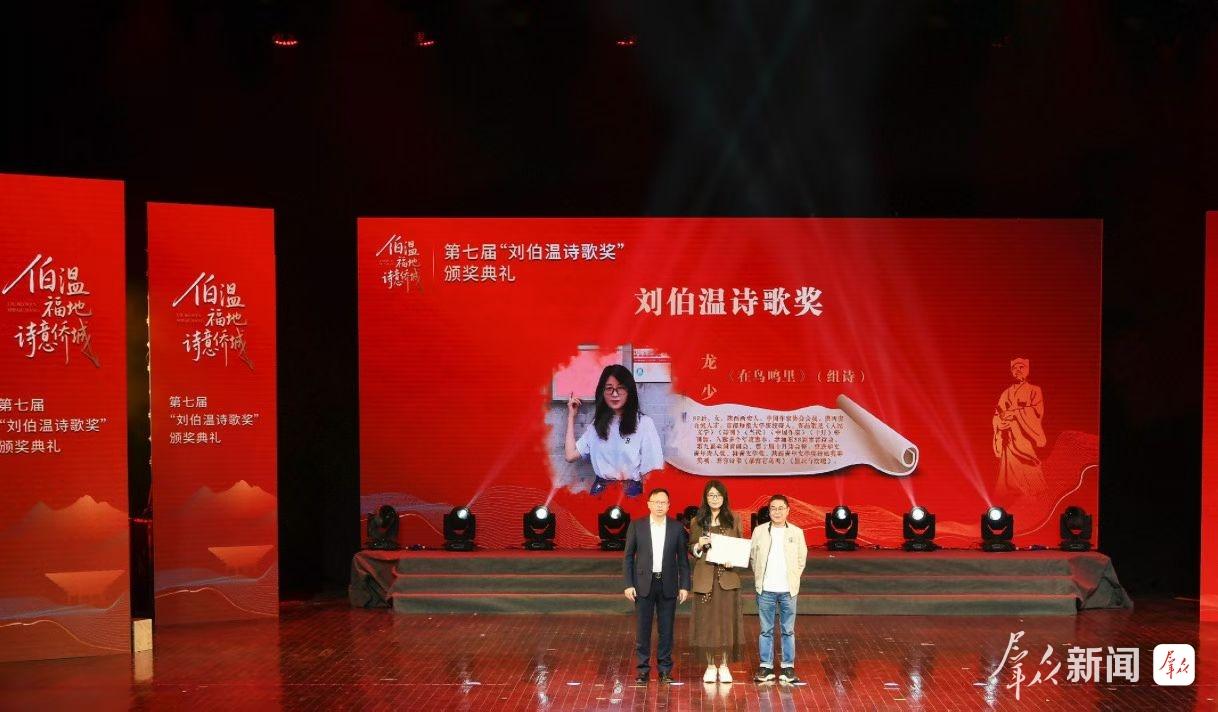 10月24日,第七届中国“刘伯温诗歌奖”揭晓,共评选出杰出诗人奖2名,诗歌奖3名、提名奖7名。陕西诗人龙少的作品《在鸟鸣里》(组诗)荣获诗歌奖。
