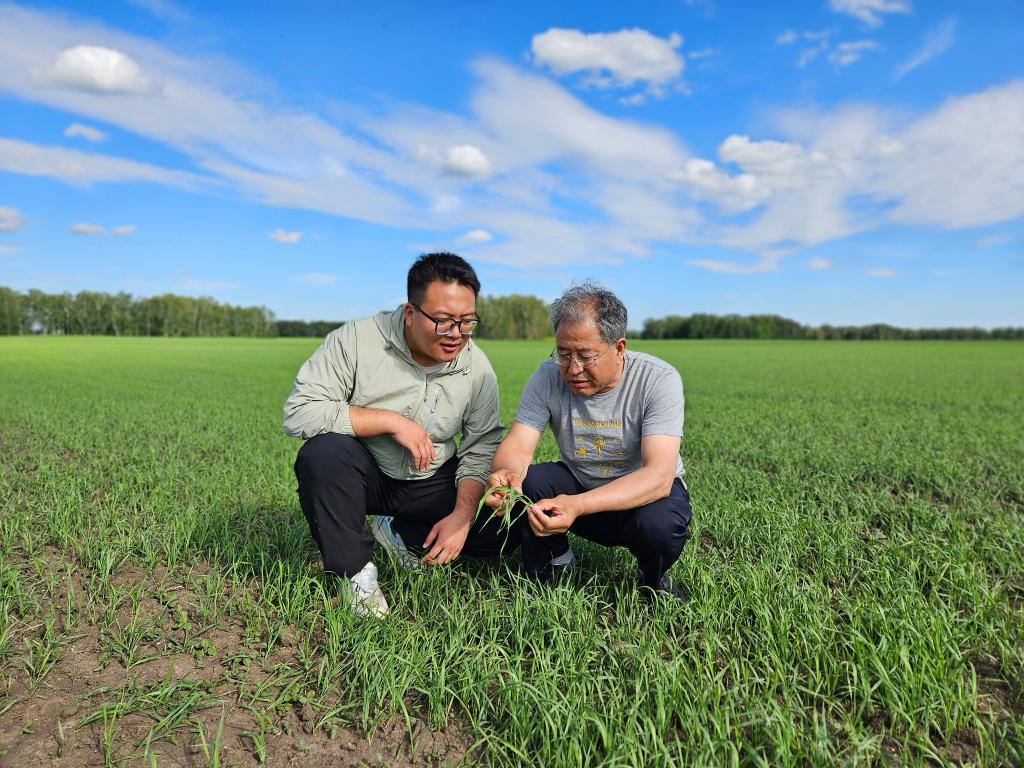 2024年6月19日,西北农林科技大学研究员张正茂(右)与学生在哈萨克斯坦北哈州的农业示范园查看小麦生长情况。新华社发