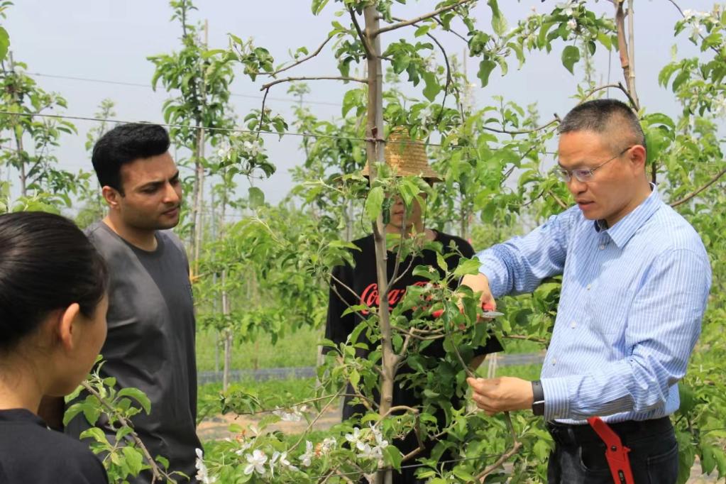 2024年4月,西北农林科技大学教授张东(右一)在吉尔吉斯斯坦与当地果农交流苹果种植技术。新华社发