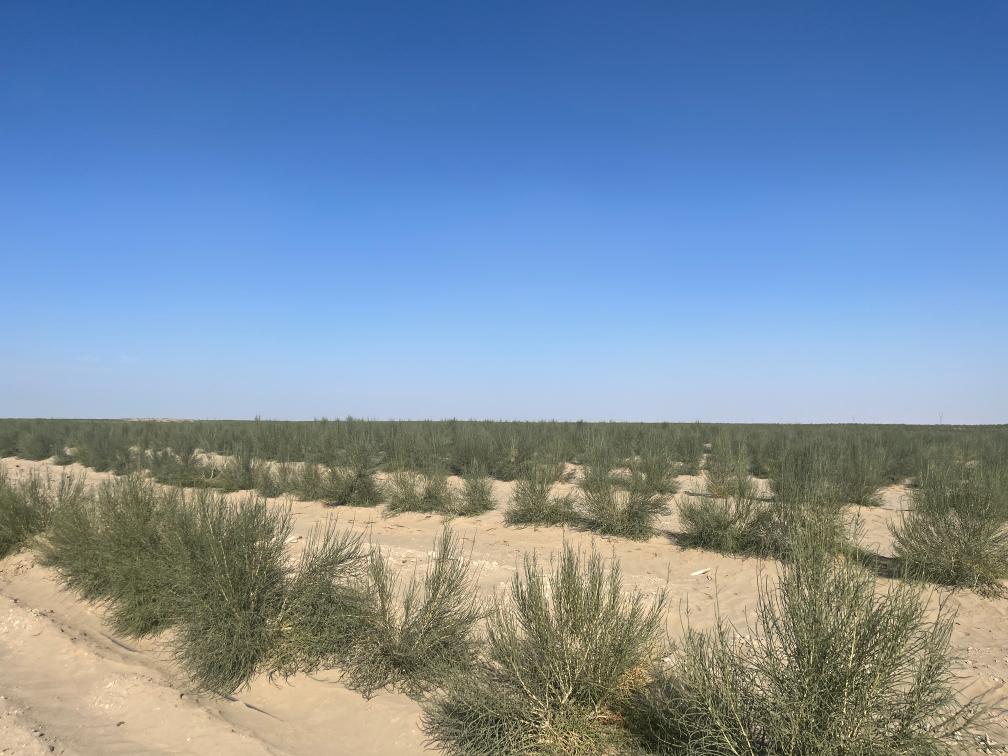 新疆阿克苏地区沙雅县盖孜库木乡防沙治沙综合示范区种植的梭梭。新华社记者杨林 摄