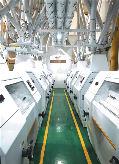 公司下属的面粉厂厂长艾散江·卡哈尔带记者走进生产车间,详细介绍面粉低温、低压、低速加工工艺。从麦粒清洗,到将其打碎、磨细,自动化运转程度很高。中间十几台机器不停运作,每台机器内是研磨程度不一的颗粒,加工后的面粉进入巨大的冷却塔中静置装袋。