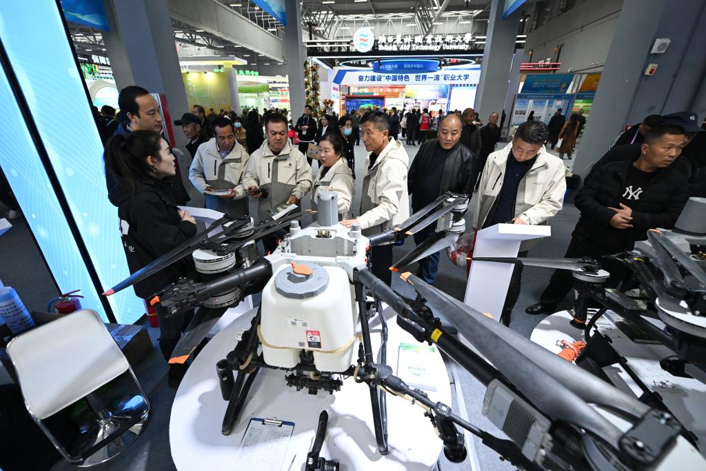 10月25日,参观者在杨凌农高会上了解大疆农业无人机。新华社记者李一博 摄