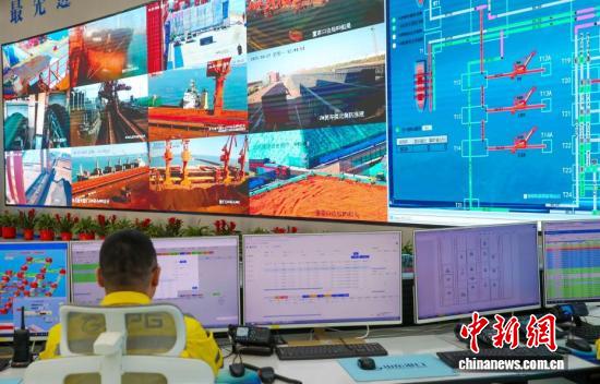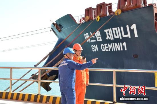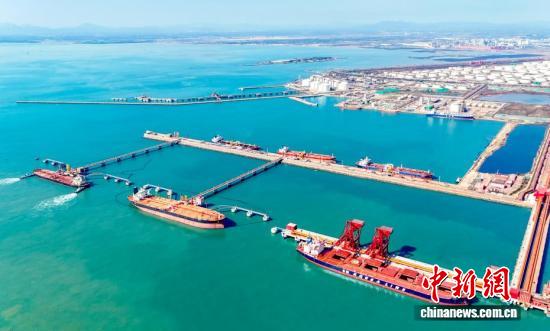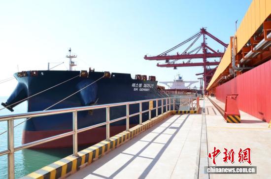 10月27日,中国首座40万吨干散货数智码头在山东青岛投产。该码头是山东港口青岛港第二座40万吨矿石码头,实现了全流程生产经营过程的实时监测、智慧决策和数字化感知,填补了中国国内超大型干散货码头数智化运营的空白。图为船舶在码头进行卸船作业。(无人机照片)