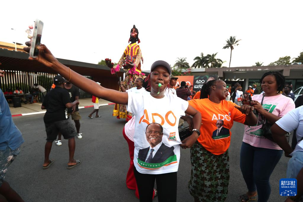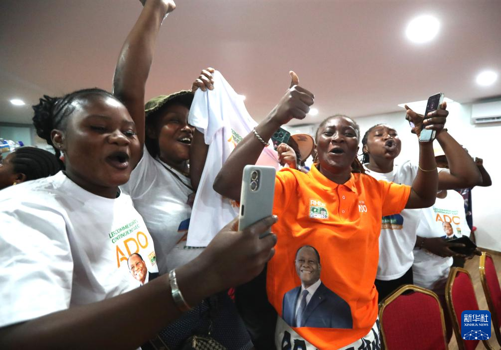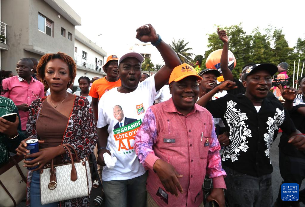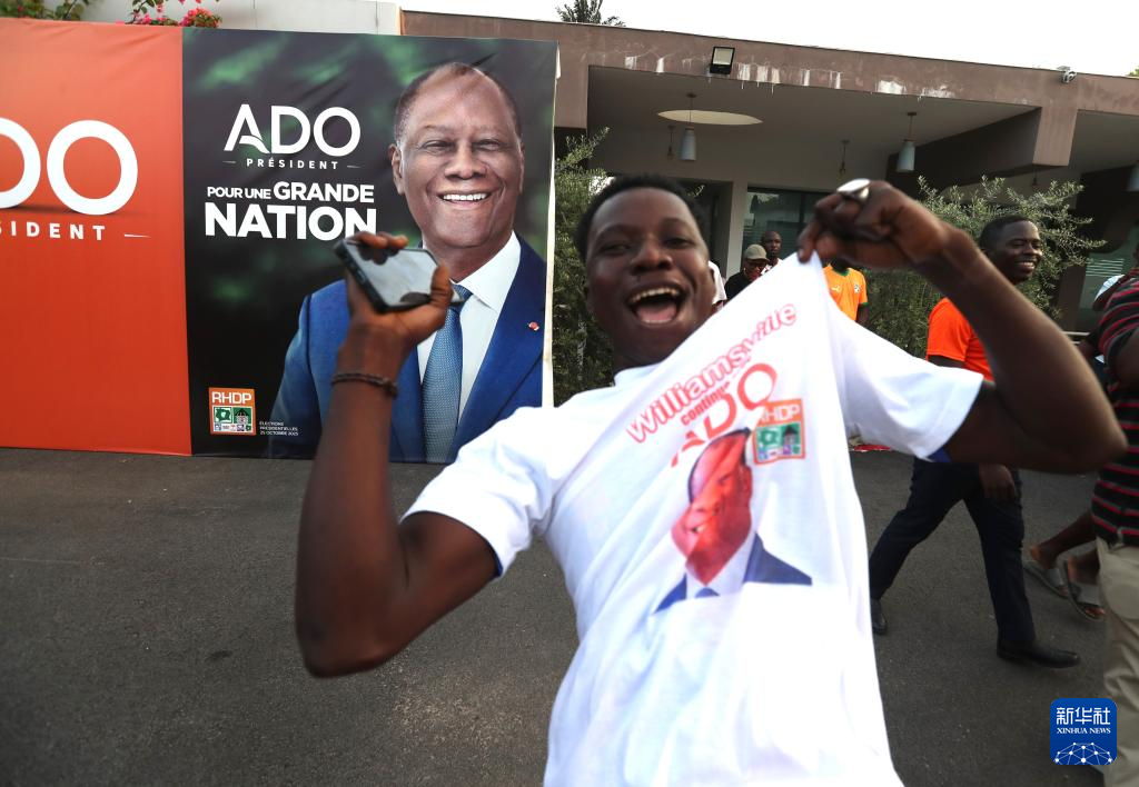 10月27日,在科特迪瓦阿比让的统一党总部,支持者庆祝统一党候选人、现任总统阿拉萨内·瓦塔拉胜选。新华社发(伊万·宋摄)
