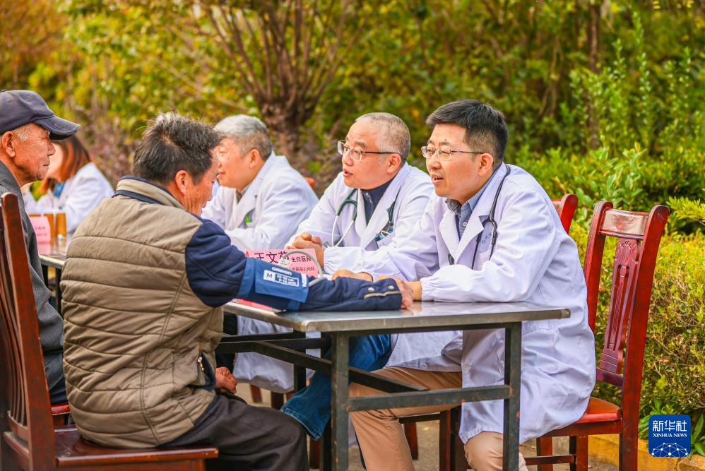 10月27日,在江苏省扬州市江都区大桥镇敬老院,医务人员为老人义诊。