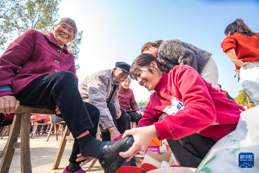 10月28日,在河南省驻马店市西平县师灵镇白庙村,27位八旬长者获赠爱心鞋。这是村妇联工作人员为90岁的孙河信老人穿上爱心鞋。