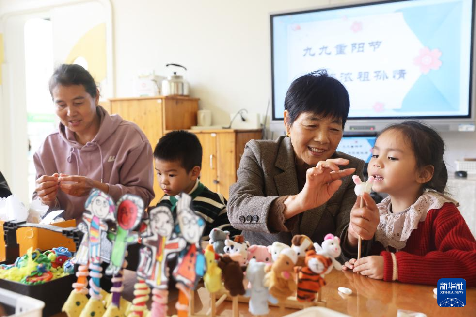 10月28日,在浙江省湖州市德清县乾元镇第一幼儿园,孩子们和老人一起制作戏偶。
