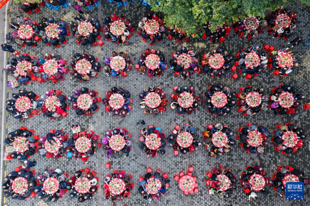 10月28日,重庆市九龙坡区华岩镇石龙社区开展“九九重阳节 浓浓百家情”主题活动,老人们在“长寿宴”活动现场用餐(无人机照片)。