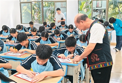 在乐东中学“法治剪纸”课堂上,剪纸课指导老师给孩子们做辅导讲解。
