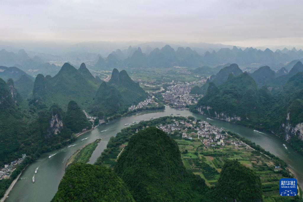 这是群山环绕的桂林市阳朔县兴坪镇乡村(无人机照片,2021年4月25日摄)。