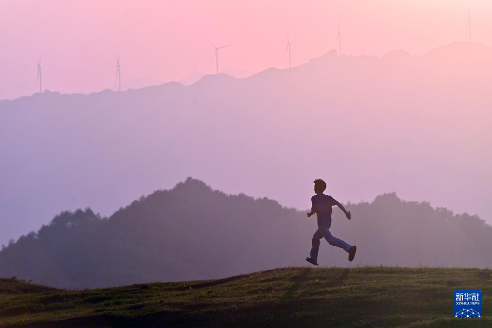 在广西融水苗族自治县杆洞乡尧告村高山牧场,一名少年在夕阳下奔跑(2024年8月14日摄)。
