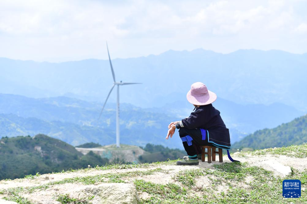 在广西融水苗族自治县杆洞乡尧告村高山牧场,老人在山顶眺望远山(2021年8月22日摄)。