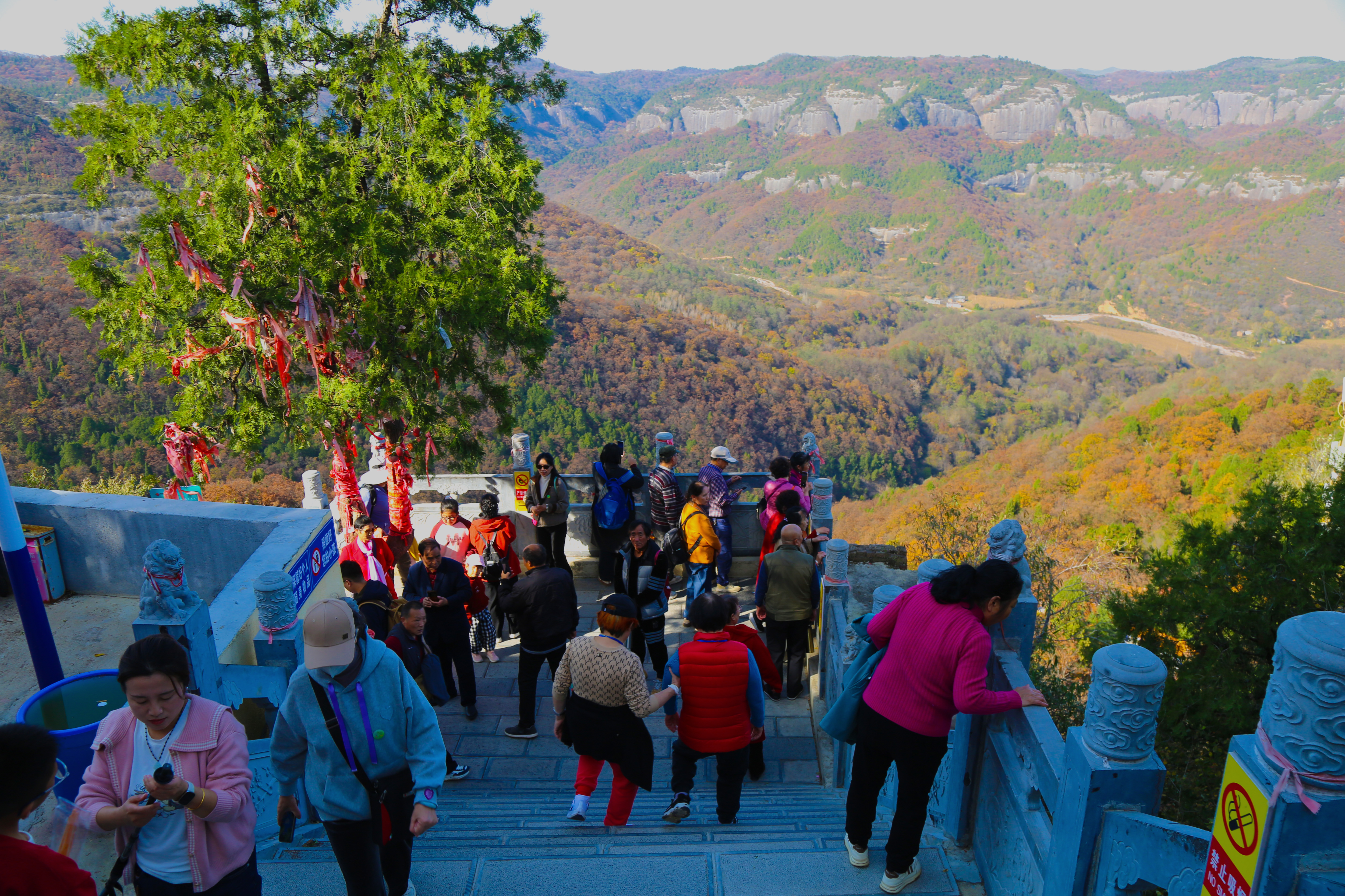 连日来的晴好天气,为出游赏秋提供了绝佳条件。在薛家寨景区,高耸的丹霞与斑斓的林木相映成趣,构成了一幅雄浑与秀美兼具的壮丽画卷。一面红旗迎风飘扬,一首红歌响彻山谷,一山红叶陶醉万人。游客们或沿着步道拾级而上,沉醉于“红叶丹霞两相宜”的独特风光。漫山遍野的黄栌、枫树等树种披上了红色“盛装”,从簇簇点点到连片成海,将整个山谷渲染得五彩斑斓,令人流连忘返。