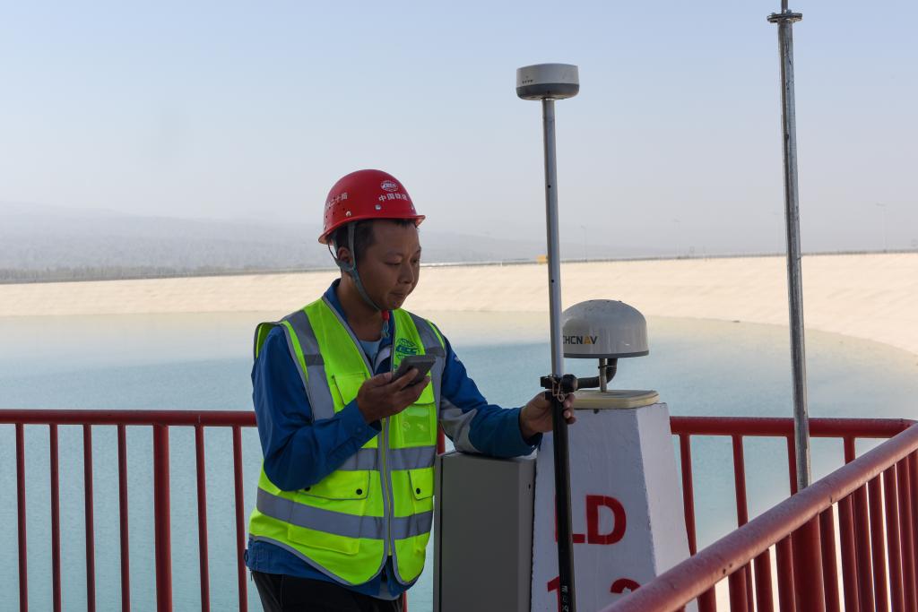 11月1日,施工人员在奥吞勒克水库检查闸控系统设备试运行情况。新华社记者 高晗 摄