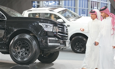 不久前,2025年沙特国际猎鹰与狩猎文化展在沙特阿拉伯首都利雅得举行,并专门设立了中国展区。图为沙特观众参观中国越野汽车品牌的展台。