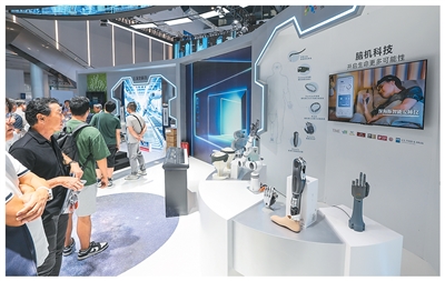 近日,在第四届全球数字贸易博览会数智未来主题展区的杭州六小龙专区,观众观看强脑科技的仿生灵巧手。