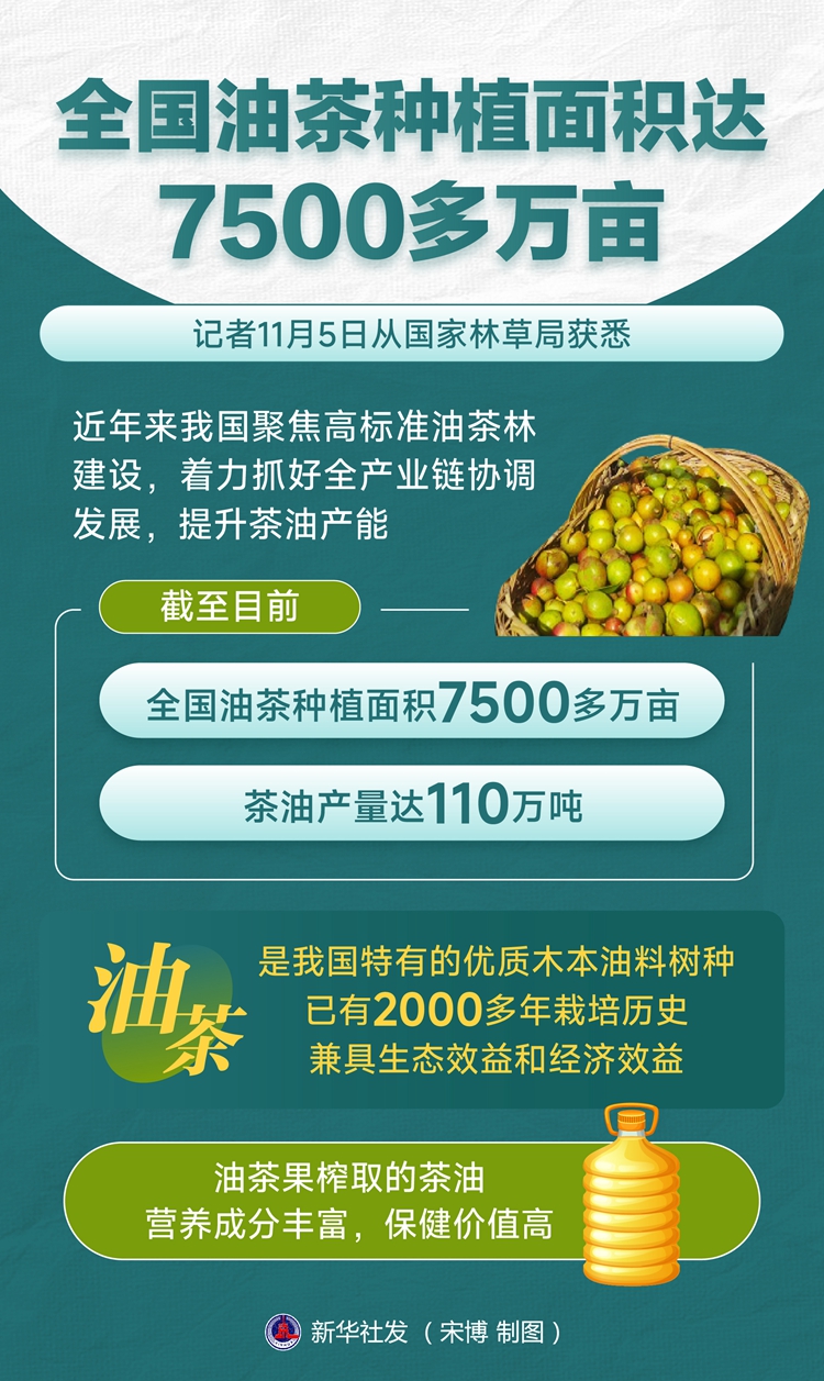 新华社北京11月5日电(记者 黄垚)记者11月5日从国家林草局获悉,近年来我国聚焦高标准油茶林建设,着力抓好全产业链协调发展,提升茶油产能。截至目前,全国油茶种植面积7500多万亩,茶油产量达110万吨。