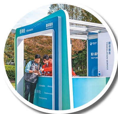 日前,进博会志愿者在国家会展中心(上海)为外国展商指路。