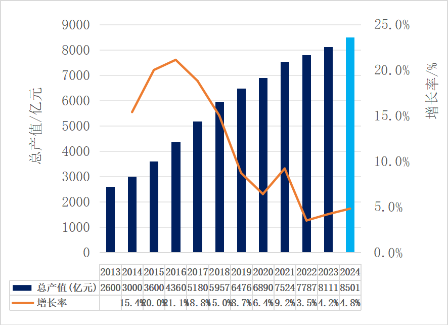 北斗系统与我国地理信息产业相互支撑、深度融合,北斗系统为地理信息产业提供高精度时空基准,地理信息产业推动北斗技术广泛应用和产业化。报告显示,2024年我国地理信息产业总产值超过8500亿元,从业单位超过24万家,从业人员近400万人,产业增速达4.8%,近5年复合增长率为5.6%,近10年复合增长率为11.0%。