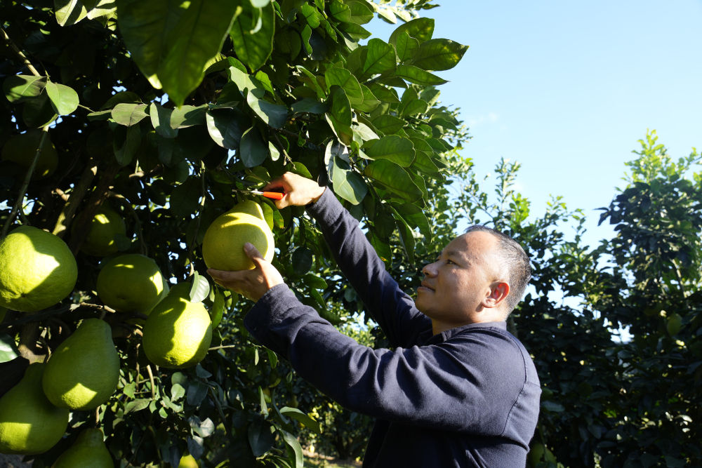 2025年11月7日,柚农在梅州南福金柚种植基地采摘柚子。