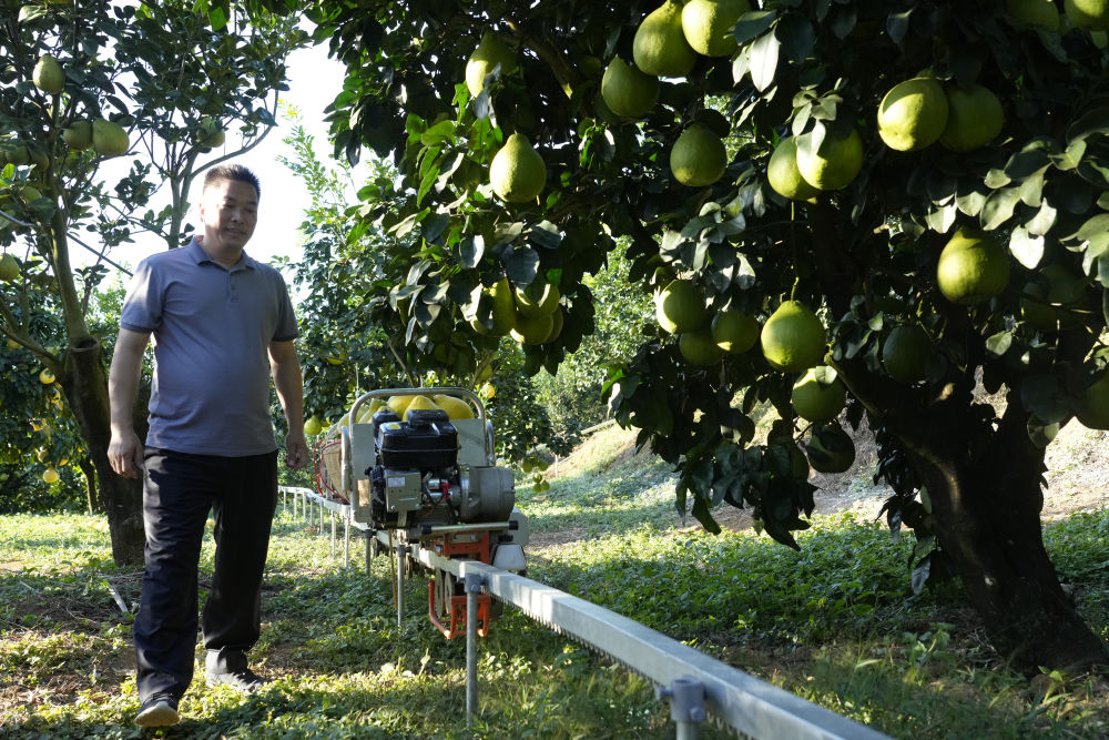 2025年11月7日,在梅州南福金柚种植基地,柚农通过山地运输车运输柚子。