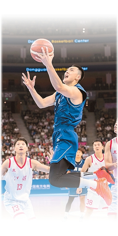 广东队球员胡明轩(上)在篮球男子成年组比赛中突破上篮。