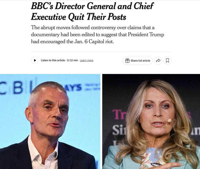 英国媒体《每日电讯报》近日曝光了一份由迈克尔·普雷斯科特撰写的BBC内部备忘录,迈克尔·普雷曾受雇为BBC提供有关编辑标准和准则方面的咨询。备忘录披露,一段在美国大选前一周于BBC栏目中播出的视频,涉嫌拼接特朗普2021年1月6日的演讲视频,使其看起来似乎在煽动当天的国会山暴乱。备忘录指出,BBC的剪辑“制造了一种假象”,“构成严重误导”。