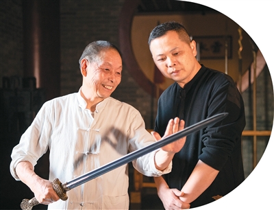沈新培(左)向沈州讲授铸剑技艺。