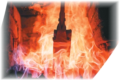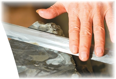 在他的手上,配好的铁料入炉加热,并反复折叠锻打。“要反复折叠数次,少则千层,多则上万层。”沈新培一边介绍,一边用锤子一次次敲击烧红的剑身,屋内火花四溅。完成淬火后,宝剑在名叫“亮石”的磨石上磨制,寒光闪闪。