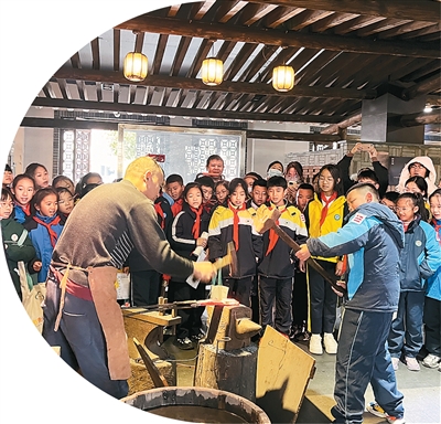 小学生在沈广隆剑铺体验宝剑锻打。