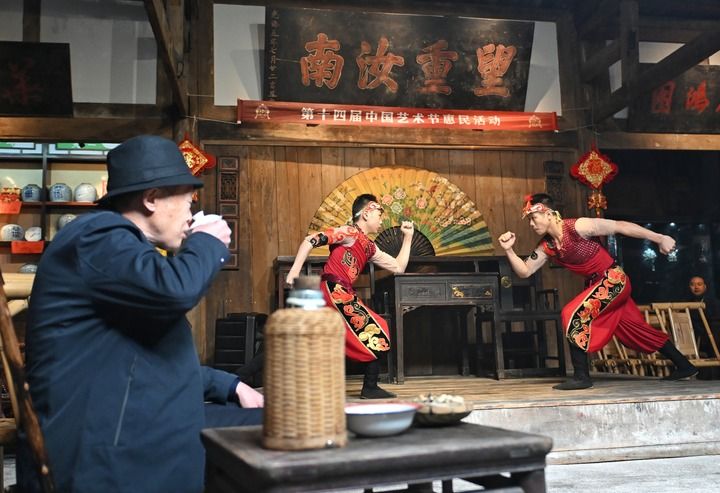 2025年10月25日,茶客在成都金琴老茶馆一边喝茶一边观看沈阳杂技演艺集团杂技演员表演的杂技节目《男子对手》,这是第十四届中国艺术节惠民活动之一。新华社记者 刘坤 摄