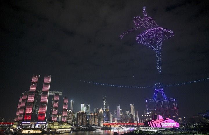 这是2025年10月27日晚在重庆市南岸区南滨路拍摄的无人机灯光秀表演活动。新华社记者 陈诚 摄