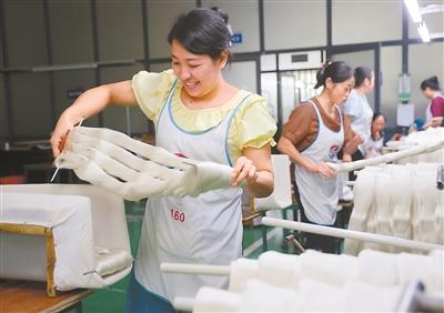 重庆市黔江区围绕茧丝绸和蚕桑生物两大产业集群,引进多家龙头企业建起丝绸工业园,形成集栽桑、养蚕、缫丝、织绸、服装生产于一体的全产业链,近3年创汇超过4000万美元。图为工人在黔江高新区一丝绸公司生产车间整理生丝。